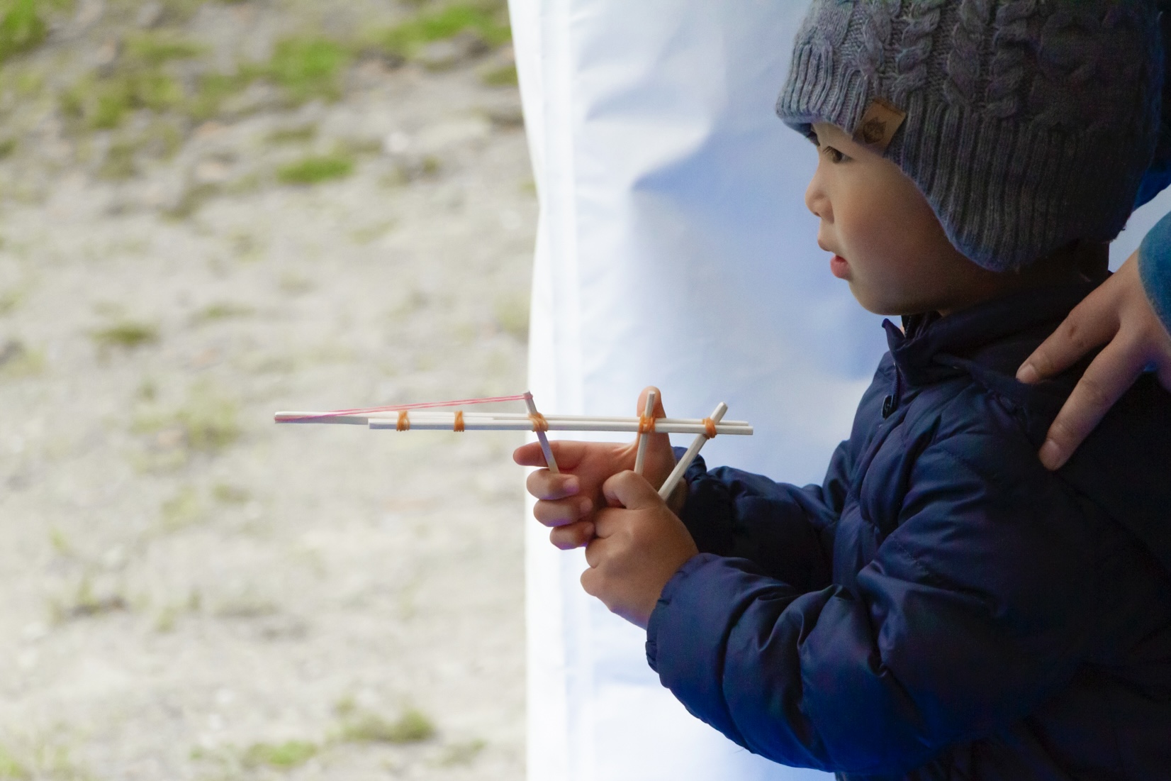 割りばしと輪ゴムで鉄砲をつくって遊びます。